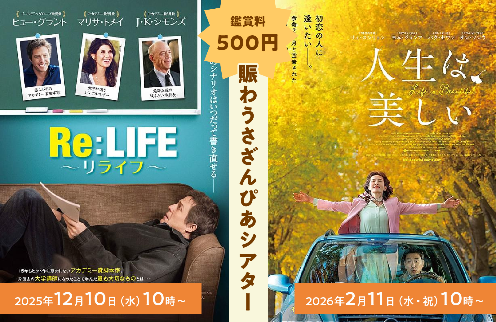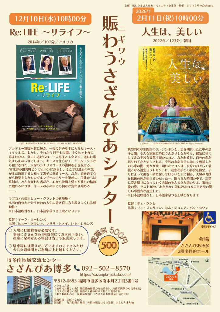 さざんぴあ博多では、毎回ご好評いただいている「賑わうさざんぴあシアター」を12月と2月に開催します。今回は、心温まる感動作と、大人のユーモアに満ちた作品の2本を上映します。ぜひゆっくりと映画鑑賞をお楽しみください。